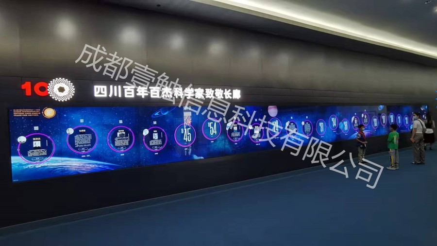 总公司助力四川百年百杰科学家致敬长廊,我们多年超大尺寸交互式触摸技术,配套18块拼接屏,十多米超长距离,完成整屏触摸交互功能